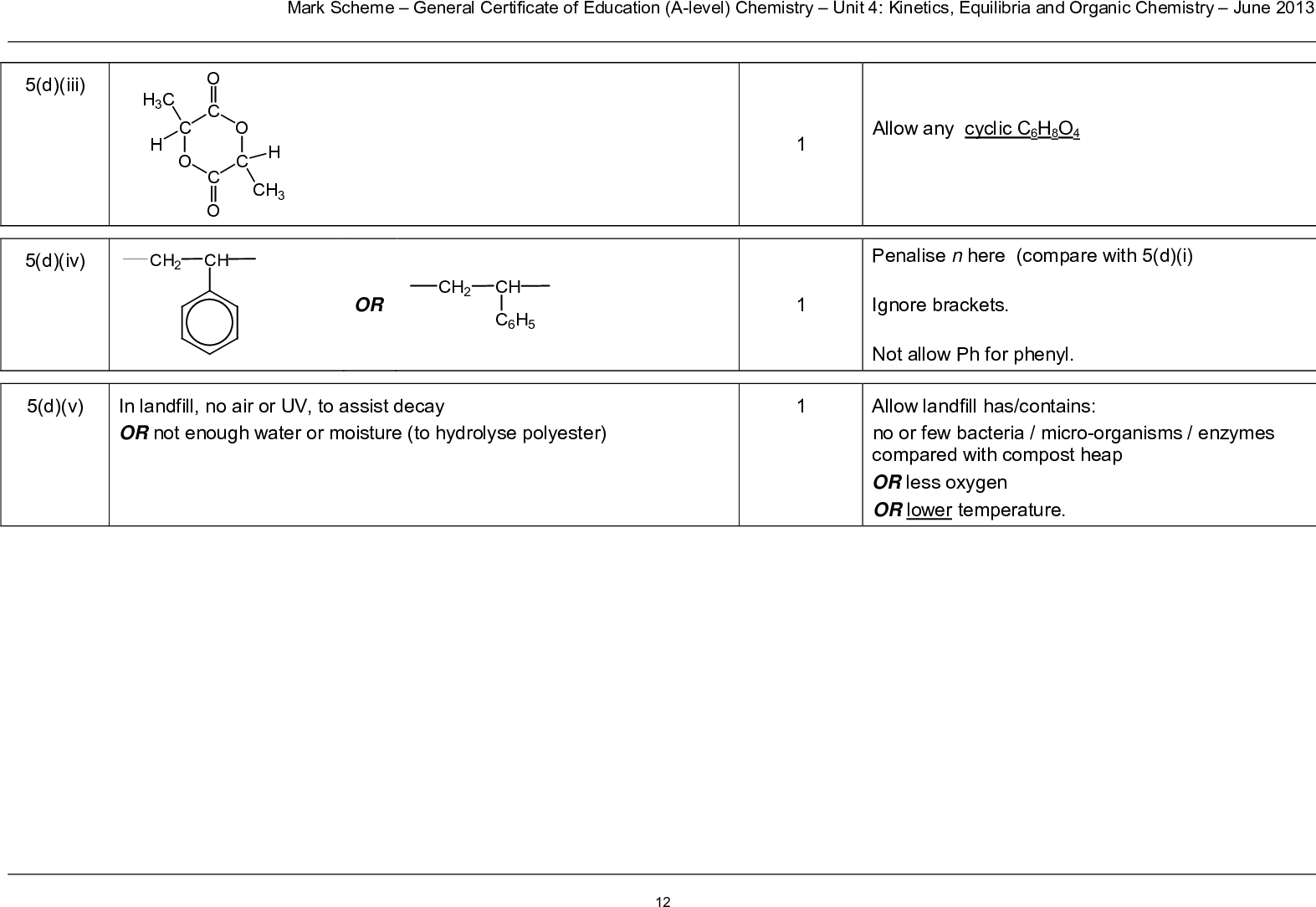 Polymers from alkenes (j) addition polymerisation of alkenes and substituted alkenes, including: (i) the repeat unit of an addition polymer deduced from a given monomer (ii) identification of the monomer that would produce a given section of an addition polymer. Waste polymers and alternatives (k) the benefits for sustainability of processing waste polymers by: (i) combustion for energy production (ii) use as an organic feedstock for the production of plastics and other organic chemicals (iii) removal of toxic waste products, e.g. removal of HCl formed during disposal by combustion of halogenated plastics (e.g. PVC) HSW9,10 Benefits of cheap oil-derived plastics counteracted by problems for environment of landfill; the move to re-using waste, improving use of resources. (l) the benefits to the environment of development of biodegradable and photodegradable polymers. HSW9,10 Benefits of reduced dependency on finite resources and alleviating problems from disposal of persistent plastic waste.
