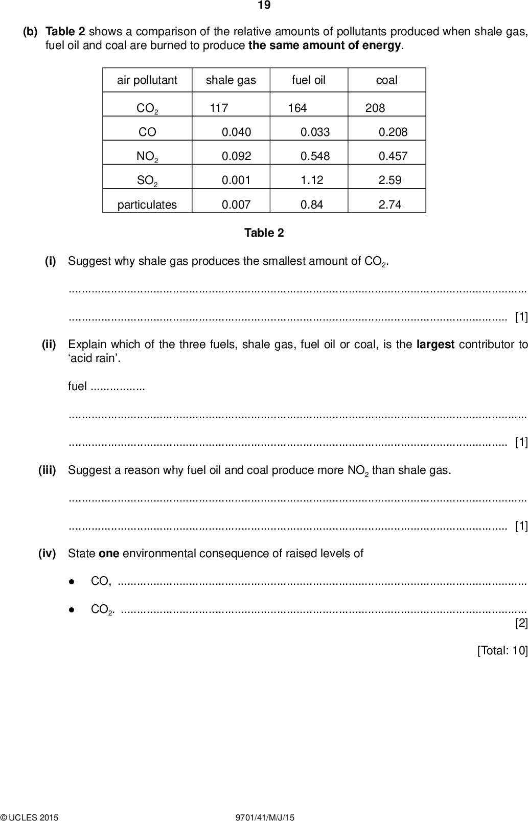 (b) Table 2 shows a comparison of the relative amounts of pollutants produced when shale gas, fuel oil and coal are burned to produce the same amount of energy. 19 air pollutant shale gas fuel oil CO2 CO NO2 SO2 particulates 117 164 0.033 0.548 1.12 0.84 0.040 0.092 0.001 0.007 Table 2 coal 208 0.208 0.457 2.59 2.74 (i) Suggest why shale gas produces the smallest amount of CO2.[1] (ii) Explain which of the three fuels, shale gas, fuel oil or coal, is the largest contributor to acid rain. fuel[1] (iii) Suggest a reason why fuel oil and coal produce more NO2 than shale gas.[1] (iv) State one environmental consequence of raised levels ofCO,CO2.[2] [Total: 10]UCLES 2015 9701/41/M/J/15<br />