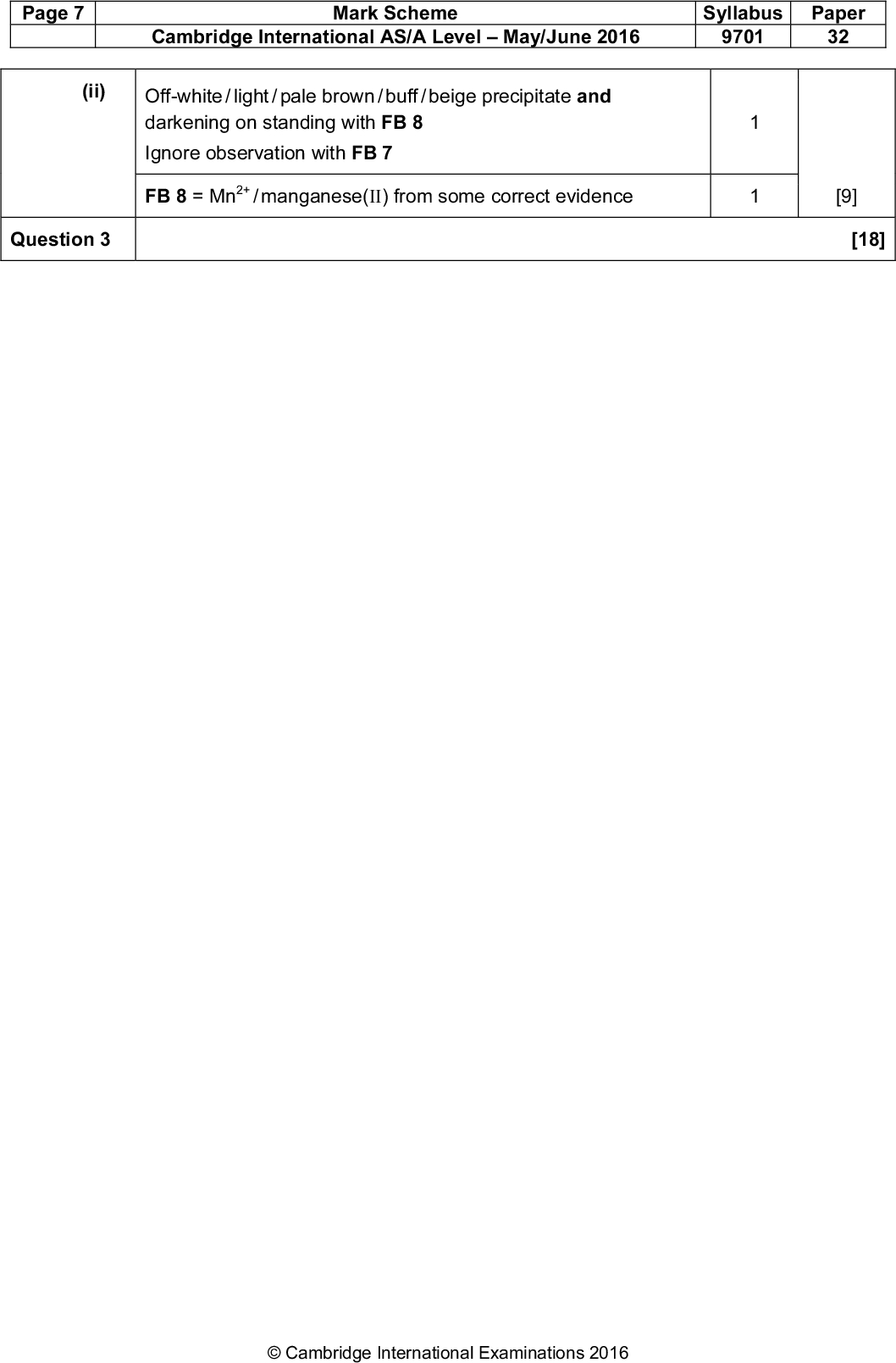 PMT (b) (i) FB 7 and FB 8 are solutions which contain different anions. These may be carbonate, halide, sulfate or sulfite. You are to devise tests to identify the two anions present. Record in a suitable table below:the reagent(s) you use for each test, the observations you make on carrying out the test, the conclusion you make from the result of the test. (ii) The cation in either FB 7 or FB 8 is a transition metal ion. Carry out the following test to identify this cation and record your observations. test To a 1 cm depth of solution in a test-tube add aqueous sodium hydroxide. observations FB 7 FB 8 FBcontains the transition metal ion.UCLES 2016 9701/32/M/J/16 [9] [Total: 18] [Turn over<br />