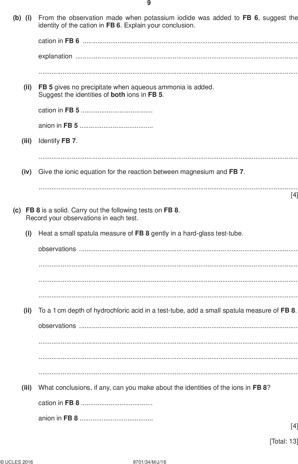 PMT (b) (i) From the observation made when potassium iodide was added to FB 6, suggest the identity of the cation in FB 6. Explain your conclusion. cation in FB 6explanation(ii) FB 5 gives no precipitate when aqueous ammonia is added. Suggest the identities of both ions in FB 5. cation in FB 5anion in FB 5(iii) Identify FB 7.(iv) Give the ionic equation for the reaction between magnesium and FB 7.[4] (c) FB 8 is a solid. Carry out the following tests on FB 8. Record your observations in each test. (i) Heat a small spatula measure of FB 8 gently in a hard-glass test-tube. observations(ii) To a 1 cm depth of hydrochloric acid in a test-tube, add a small spatula measure of FB 8. observations(iii) What conclusions, if any, can you make about the identities of the ions in FB 8? cation in FB 8anion in FB 8UCLES 2016 9701/34/M/J/16 [4] [Total: 13] [Turn over<br />