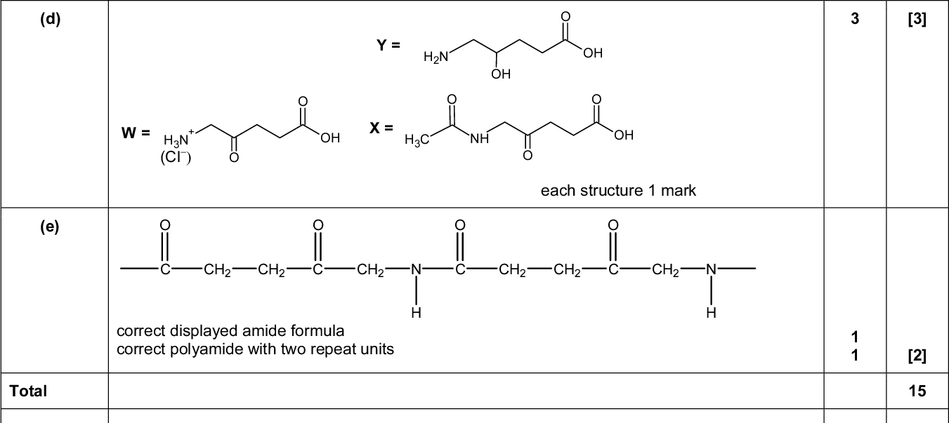 PMT 13 (ii) Name the mechanism in (c)(i).(iii) Identify the non-organic product formed in this reaction.[5] (d) Three reactions of aminolaevulinic acid are shown. Draw the structures of the products W, X and Y in the boxes below. OH H2N aminolaevulinic acid HCl (aq), warm NaBH4 CH3COCl (e) Aminolaevulinic acid can undergo polymerisation. Draw the structure of the polymer showing two repeat units. The linkages between the monomer units should be shown fully displayed. [3]UCLES 2014 9701/41/O/N/14 [2] [Total: 15] [Turn over<br />