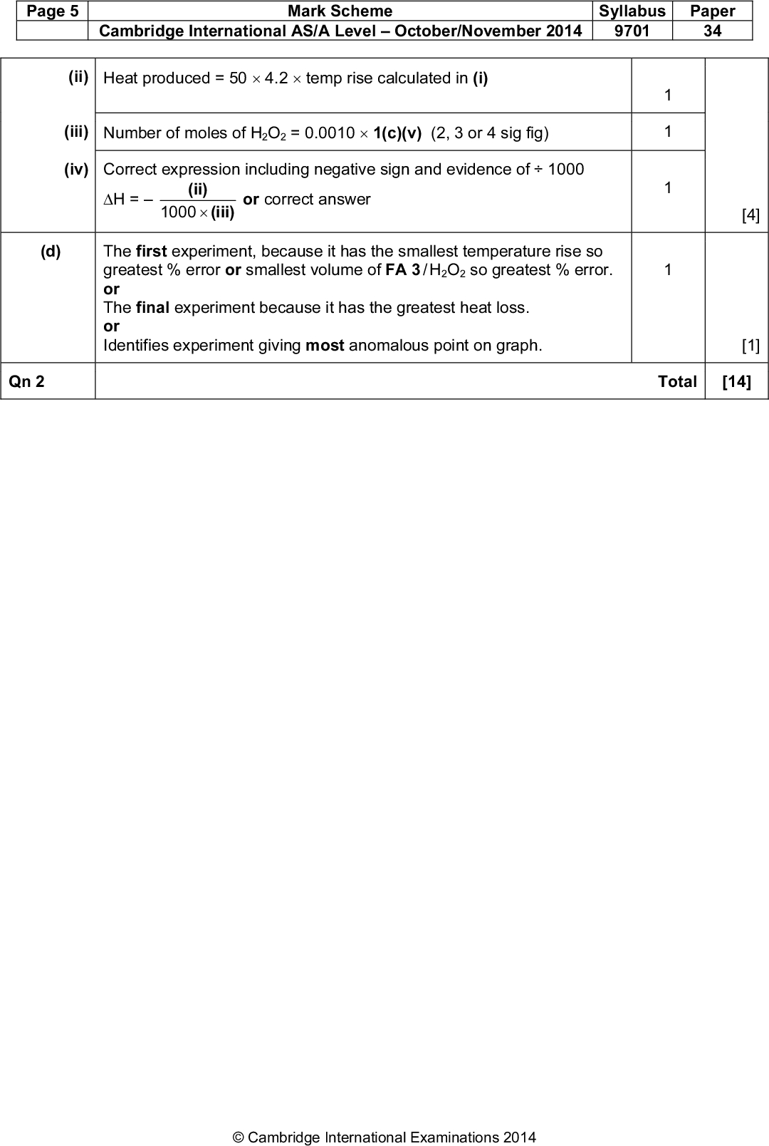 (c) Calculation (i) Use your graph to calculate the average temperature rise for each 1.0 cm3 of FB 3 used. Show your working clearly on the graph. PMT (ii) Calculate the energy released for each 1.0 cm3 of FB 3 used. (Assume that 4.2 J are needed to raise the temperature of 1.0 cm3 of solution by 1.0 C.) average temperature rise =C (iii) Use your answer to 1(c)(v) to calculate the number of moles of hydrogen peroxide in 1.0 cm3 of FB 3. (If you were unable to calculate the concentration of H2O2 in FB 3, assume that it was 1.72 mol dm3. Note: this is not the correct value.) energy released =J number of moles of H2O2 =mol (iv) Calculate the enthalpy change, in kJ mol1, for the reaction below. H2O2(aq)H2O(l) + 2 1 O2(g) enthalpy change =kJ mol1 (sign) (value) [4] (d) Which one of the four experiments that you carried out is likely to be the least accurate? Explain your choice.[1] [Total: 14]UCLES 2014 9701/34/O/N/14<br />