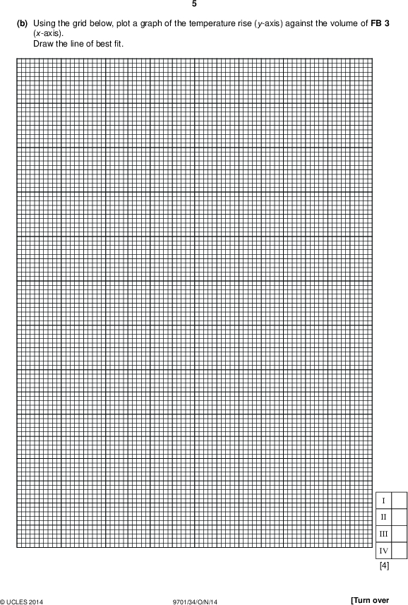 (b) Using the grid below, plot a graph of the temperature rise (y-axis) against the volume of FB 3 (x-axis). Draw the line of bestt. PMT II III IV [4]UCLES 2014 9701/34/O/N/14 [Turn over<br />