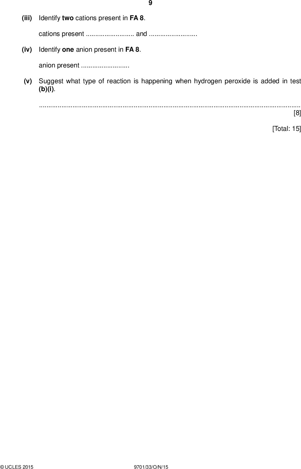PMT (b) FA 8 contains two anions and two cations from the lists on pages 10 and 11.To a 5 cm depth of distilled water in a boiling tube, add all the FA 8. Shake the boiling tube thoroughly for one minute to make sure that no more of the solid will dissolve. Filter the mixture into a clean boiling tube. Place the filter funnel in a conical flask and wash the residue with a little distilled water. Keep both filtrate and residue for tests (i) and (ii) below. (i) Tests on theltrate (the solution in the boiling tube) Carry out the following tests and record your observations in the table below. test observations To a 1 cm depth of theltrate in a test-tube, add aqueous sodium hydroxide, then add aqueous hydrogen peroxide. (ii) Tests on the residue Carry out the following tests and record your observations in the table below. test observations Place the funnel containing the residue into a clean boiling tube. Pour approximately 5 cm3 of dilute nitric acid onto the residue. Collect a 1 cm depth of solution in the boiling tube. Remove the funnel and return it to the conicalask. To this solution in the boiling tube, add aqueous sodium hydroxide.UCLES 2015 9701/33/O/N/15<br />