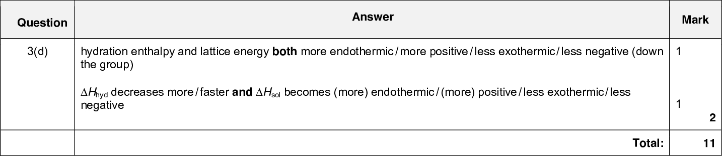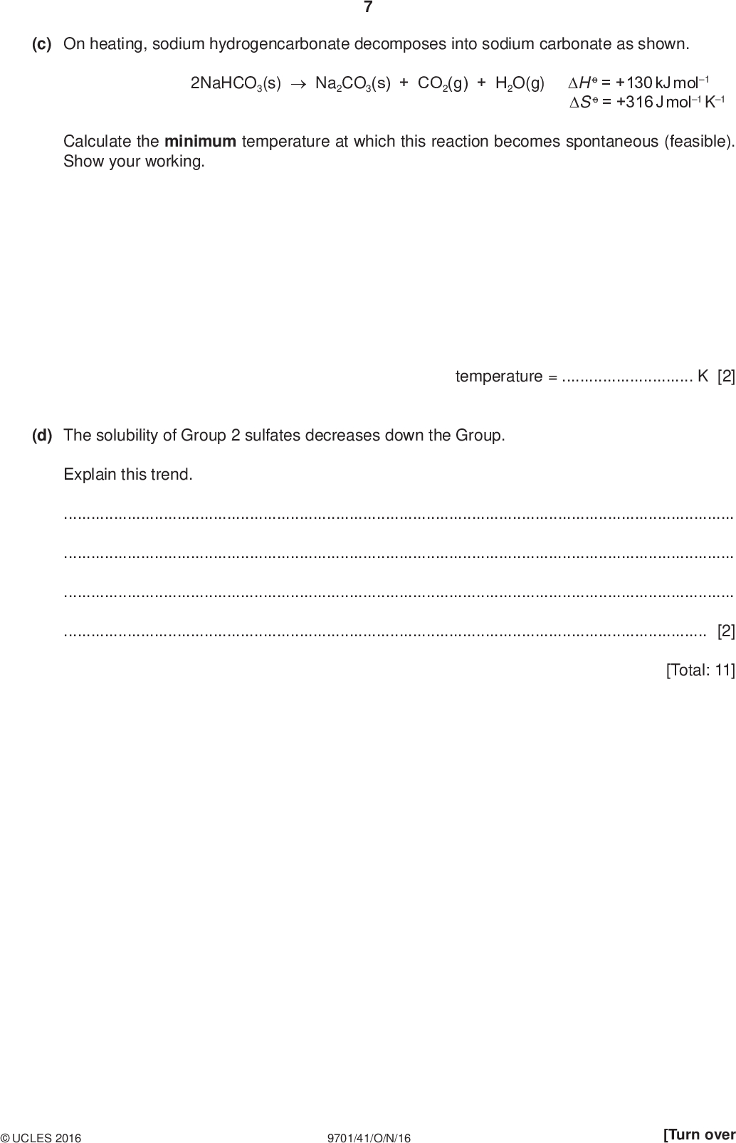(c) On heating, sodium hydrogencarbonate decomposes into sodium carbonate as shown. PMT 2NaHCO3(s)Na2CO3(s) + CO2(g) + H2O(g) H o = +130 kJ mol1 S o = +316 J mol1 K1 Calculate the minimum temperature at which this reaction becomes spontaneous (feasible). Show your working. temperature =K [2] (d) The solubility of Group 2 sulfates decreases down the Group. Explain this trend.[2] [Total: 11]UCLES 2016 9701/41/O/N/16 [Turn over<br />