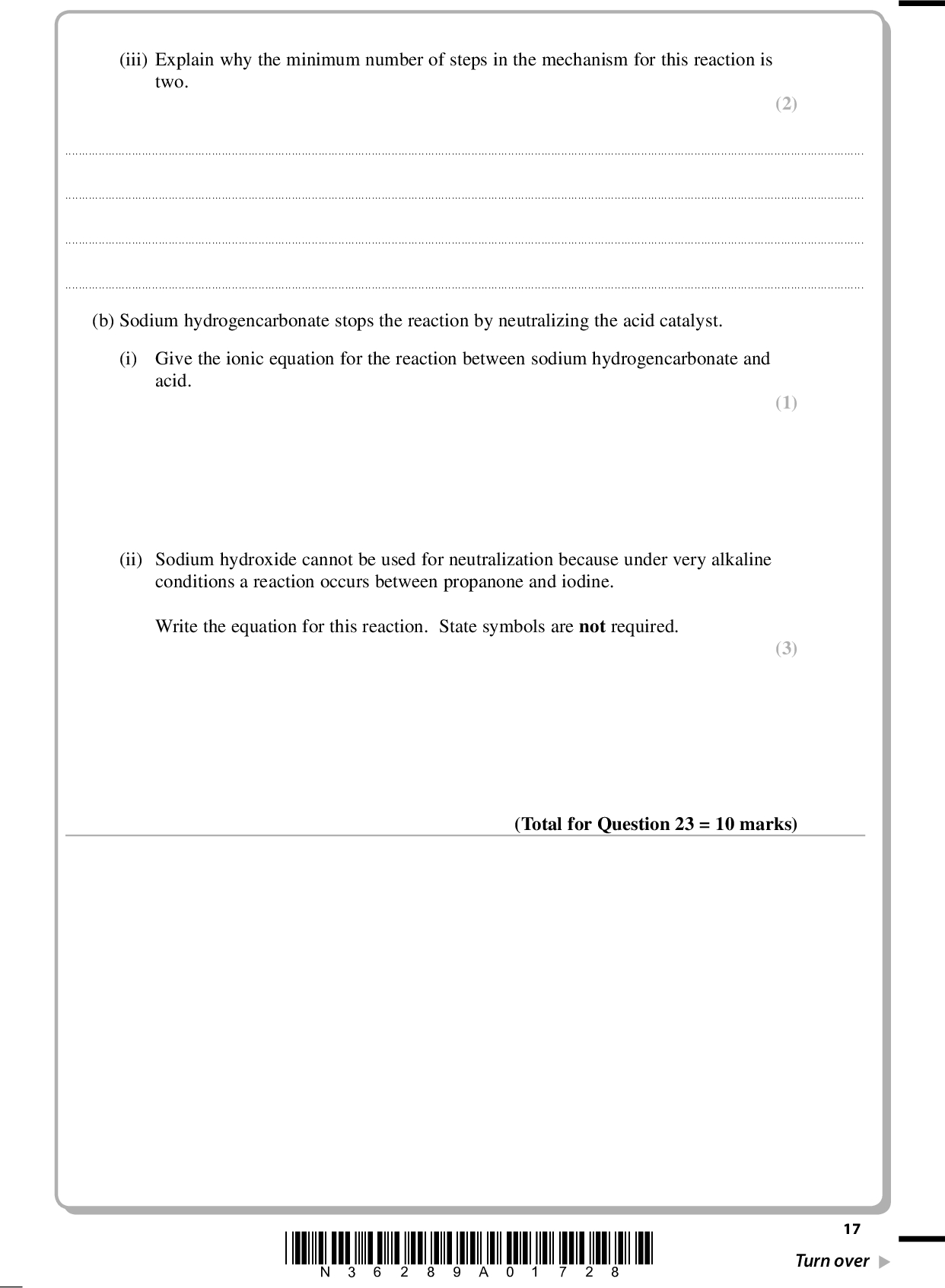 PMT (iii) Explain why the minimum number of steps in the mechanism for this reaction is (2) (1) two. acid.(b) Sodium hydrogencarbonate stops the reaction by neutralizing the acid catalyst. (i) Give the ionic equation for the reaction between sodium hydrogencarbonate and (ii) Sodium hydroxide cannot be used for neutralization because under very alkaline conditions a reaction occurs between propanone and iodine. Write the equation for this reaction. State symbols are not required. (3) (Total for Question 23 = 10 marks) *N36289A01728* 17 Turn over<br />