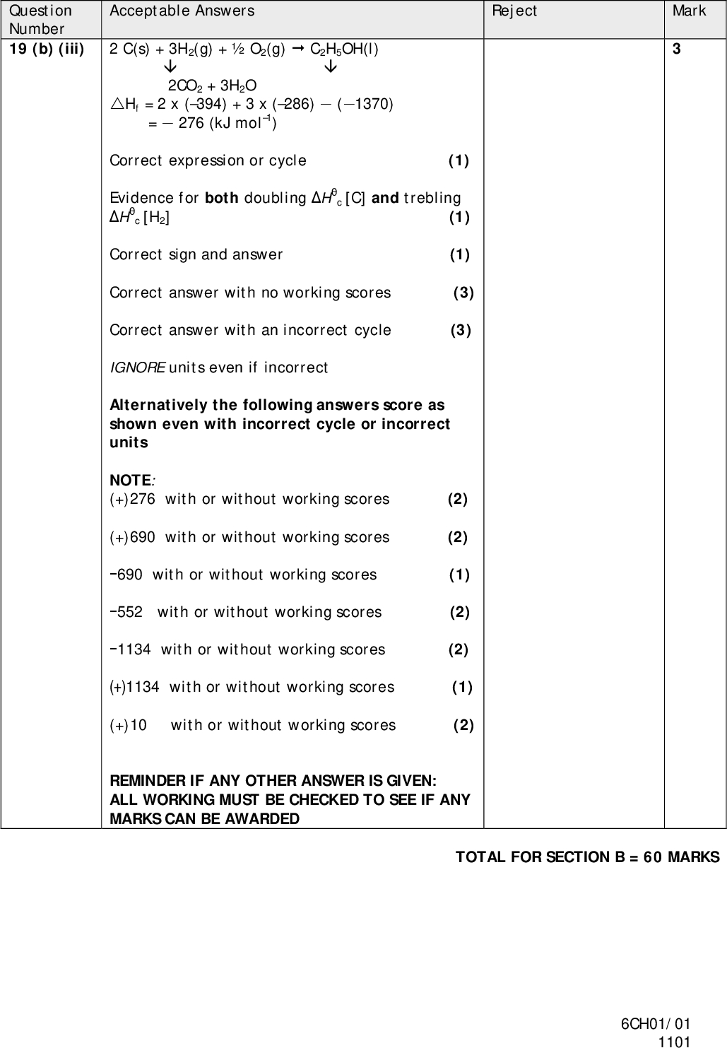 (ii) Calculate the number of moles of ethanol burned in this experiment (the formula of ethanol is C2H5OH). PMT (iii) Use the equation below to calculate the enthalpy change of combustion of ethanol in kJ mol1. Give the value an appropriate sign. (cid:168)H = heat energy producednumber of moles (b) The data book value for the enthalpy change of combustion of ethanol is 1370 kJ mol1. (i) Calculate the percentage error in the value calculated in (a)(iii) in comparison with the data book value. (3) (2) (1) 22 *N37962A02224*<br />