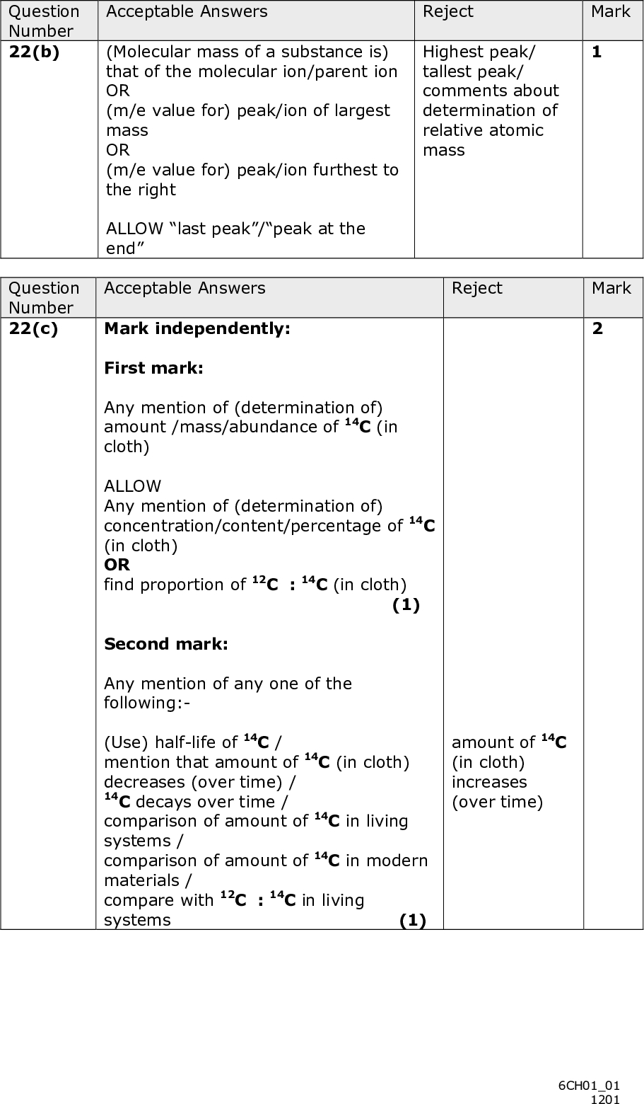 PMT 22 (a) State how the following processes are achieved in a mass spectrometer. (i) Ionization of the sample. (1)(ii) Acceleration of the ions. (1)(iii) Deflection of the ions. (1)(b) State how you could find the molecular mass of a substance from its mass spectrum. (1)(cid:3) (cid:11)(cid:70)(cid:12)(cid:3)(cid:47)(cid:76)(cid:89)(cid:76)(cid:81)(cid:74)(cid:3)(cid:87)(cid:75)(cid:76)(cid:81)(cid:74)(cid:86)(cid:3)(cid:87)(cid:68)(cid:78)(cid:72)(cid:3)(cid:88)(cid:83)(cid:3)(cid:87)(cid:75)(cid:72)(cid:3)(cid:85)(cid:68)(cid:71)(cid:76)(cid:82)(cid:68)(cid:70)(cid:87)(cid:76)(cid:89)(cid:72)(cid:3)(cid:76)(cid:86)(cid:82)(cid:87)(cid:82)(cid:83)(cid:72)(cid:3)(cid:70)(cid:68)(cid:85)(cid:69)(cid:82)(cid:81)(cid:16)(cid:20)(cid:23)(cid:3)(cid:73)(cid:85)(cid:82)(cid:80)(cid:3)(cid:87)(cid:75)(cid:72)(cid:3)(cid:68)(cid:87)(cid:80)(cid:82)(cid:86)(cid:83)(cid:75)(cid:72)(cid:85)(cid:72)(cid:17)(cid:3)(cid:3) In recent years a particular linen cloth was shown, using mass spectrometry, to have been made from flax grown in the early 14th century. Suggest how mass spectrometry can be used to estimate the age of the cloth. (2)(Total for Question 22 = 6 marks) *P39295A01524* 15 Turn over<br />