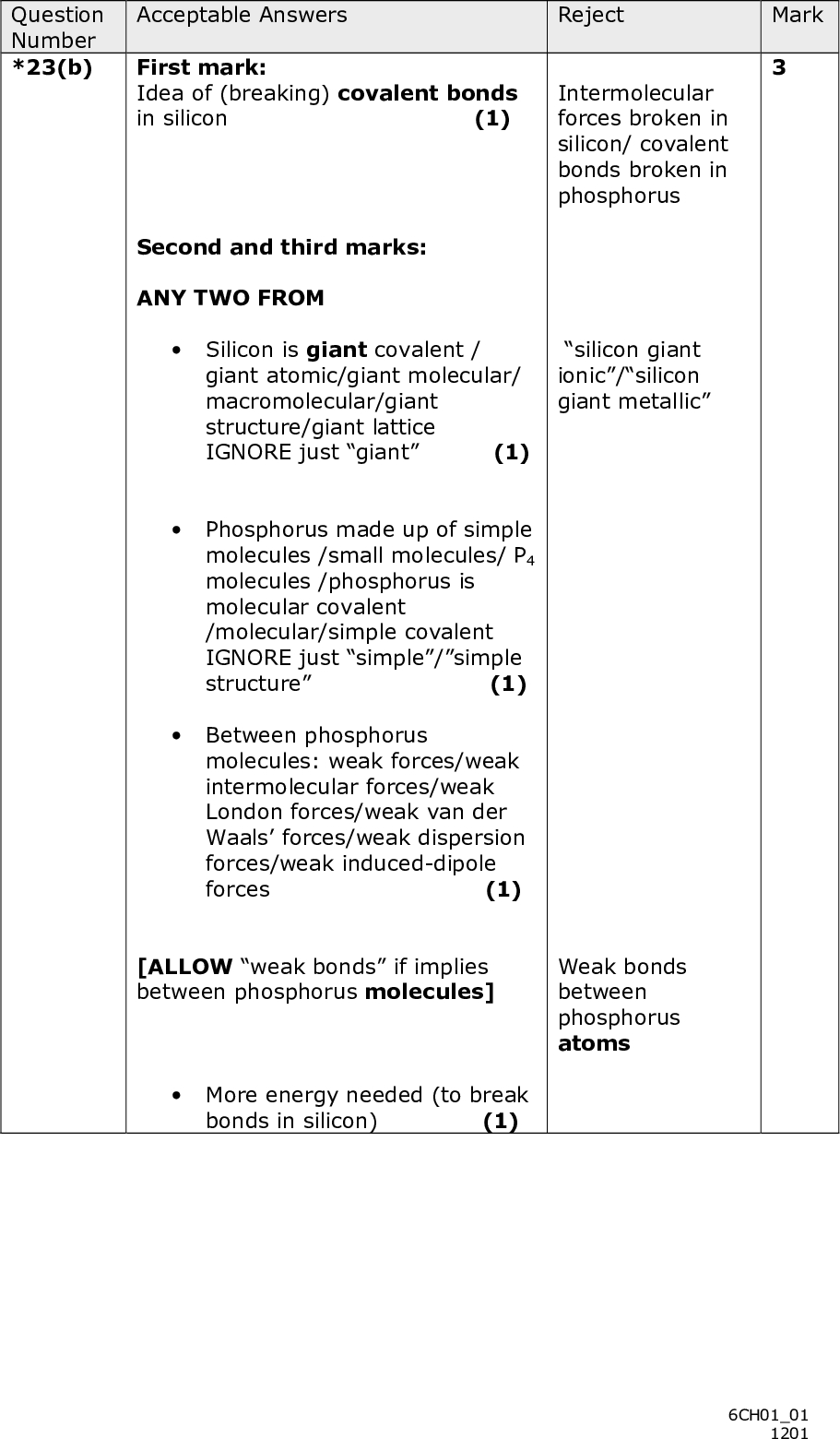 PMT *23 The melting temperatures of the elements of Period 3 are given in the table below. Use these values to answer the questions that follow. Element Melting temperature / K Na 371 Mg 922 Al Si (white) (monoclinic) 933 1683 317 392 Cl 172 Ar 84 (a) Explain why the melting temperature of sodium is very much less than that of magnesium. (3)(b) Explain why the melting temperature of silicon is very much greater than that of white phosphorus. (3)16 *P39295A01624*<br />