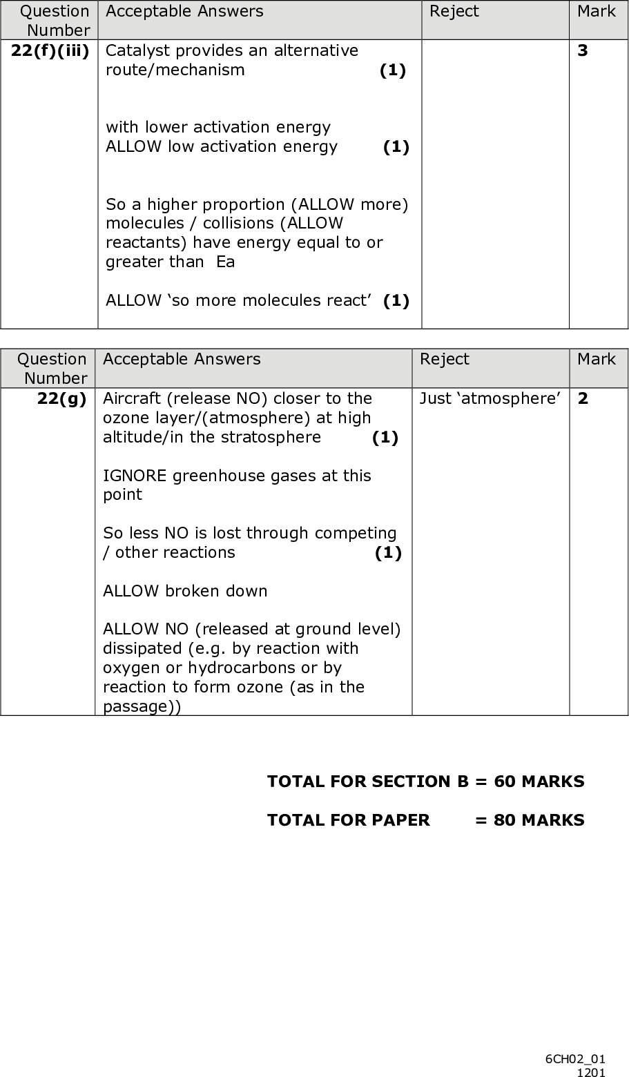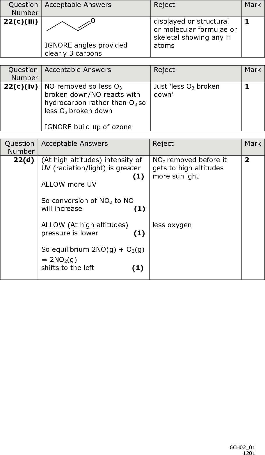 PMT SECTION C Answer ALL the questions. Write your answers in the spaces provided. 22 Nitrogen monoxide is an unusual molecule both in its chemical structure (shown below) and in its impact on our lives. N O Nitrogen monoxide is an important chemical messenger in all mammals and, at appropriate concentrations, it is vital to life; however, at high concentrations in the body, it is extremely toxic. Nitrogen monoxide is considered a dangerous atmospheric pollutant; it is involved in the formation of a range of toxic substances, including ozone, at low altitudes, and in the depletion of the ozone layer at high altitudes. Nitrogen monoxide is formed by the direct combination of nitrogen and oxygen at high temperatures, a reaction that occurs naturally in lightning discharges, and as a by- product of the reactions in internal combustion and jet engines. Catalytic converters reduce nitrogen monoxide emissions from car engines by catalysing the reaction between nitrogen monoxide and carbon monoxide to form nitrogen and carbon dioxide. The reactions of nitrogen monoxide which involve ozone in the atmosphere are summarised below. 2NO(g) + O2(g) (cid:85) 2NO2(g) NO2(g) UV radiation NO(g) + O(g) O2(g) + O(g) NO(g) + O3(g) O3(g) NO2(g) + O2(g) When the ratio of nitrogen dioxide to nitrogen monoxide is high (> 3), the rate of formation of ozone is faster than its rate of removal. When the ratio is low (< 0.3), the reverse is true. Ozone causes breathing difficulties, headaches, fatigue and can aggravate respiratory problems. The reaction of nitrogen monoxide with hydrocarbons can also produce other toxic compounds, such as aldehydes. (a) Write the equation for the formation of nitrogen monoxide from nitrogen and oxygen. State symbols are not required. (1) 18 *P39303A01824*<br />