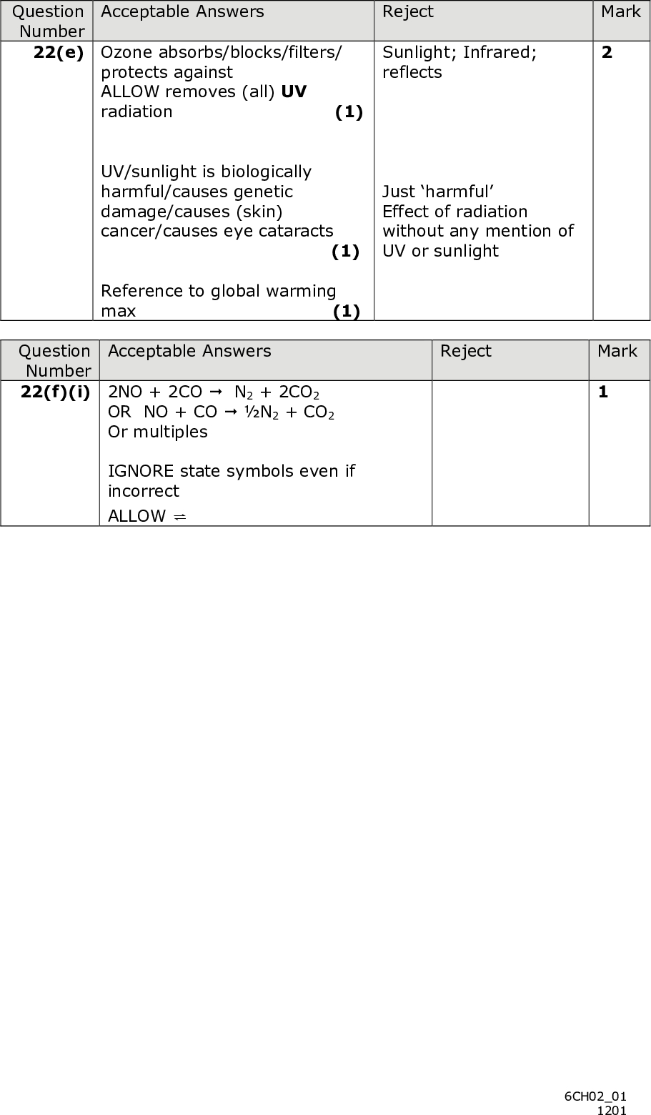 PMT (d) Suggest why the proportion of nitrogen dioxide might be reduced at high altitudes. (2)(e) Explain why it is important to maintain the concentration of ozone in the upper atmosphere. (2)(f) (i) Write an equation for the reaction on a catalytic converter described in the passage. State symbols are not required. (1) 20 *P39303A02024*<br />