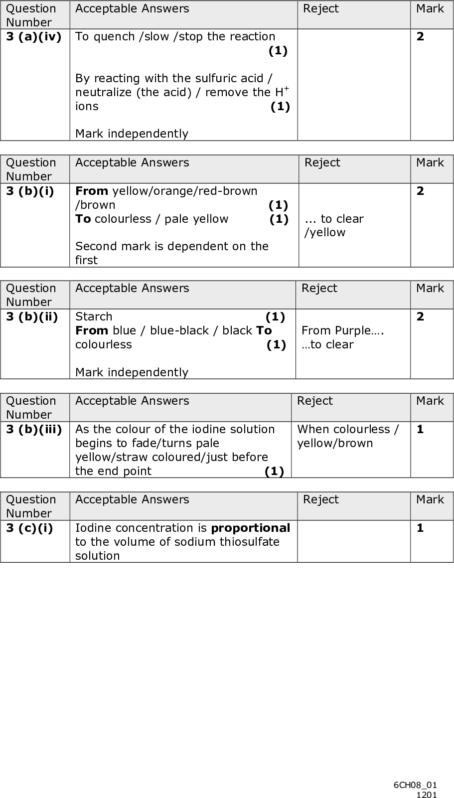 PMT 3 The equation for the reaction of iodine with propanone is CH3COCH3(aq) + I2(aq) (cid:111) CH3COCH2I(aq) + H+(aq) + I(aq) An experiment was carried out to find the order of reaction with respect to iodine. 50 cm3 of iodine solution, concentration 0.020 mol dm3, was added to 25 cm3 of sulfuric acid, concentration 2.0 mol dm3, in a conical flask. 25 cm3 of propanone solution, concentration 2.0 mol dm3, was added to the mixture and a timer started. A 10.0 cm3 sample was removed after one minute. Further 10.0 cm3 samples were removed every three minutes. Immediately, each sample was added to 20 cm3 of sodium hydrogencarbonate solution (an excess). Each sample was then titrated with sodium thiosulfate solution, concentration 0.010 mol dm3. (a) (i) Show, by calculation of the number of moles, whether propanone or iodine was in excess. (ii) What would be the most suitable piece of apparatus for removing a 10.0 cm3 sample from the mixture? (2) (1)(iii) What would be the most suitable piece of apparatus for measuring 20 cm3 of the sodium hydrogencarbonate solution? (1)*P35988A0616*<br />
