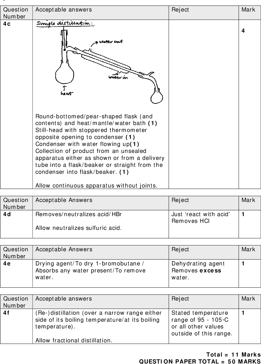 4 The procedure below can be used to make 1-bromobutane. 1. Place a mixture of water, sodium bromide and butan-1-ol in a round- bottomed flask. 2. Slowly add a suitable volume of concentrated sulfuric acid to this mixture whilst it is also shaken and cooled. 3. When this addition is complete, heat the mixture under reflux for about 45 minutes. 4. Rearrange the apparatus for distillation and distil off the crude 1-bromobutane, collecting the distillate between 95and 105 C. 5. Shake the 1-bromobutane first with water, then with dilute sodium carbonate solution. 6. Separate the 1-bromobutane from the aqueous layer, add some anhydrous calcium chloride and leave the mixture to stand. 7. Decant the 1-bromobutane from the calcium chloride. (a) (i) Explain why sodium bromide and sulfuric acid are required in step 2. (1)(ii) What would be the effect on this preparation if concentrated sulfuric acid was added in step 2 without water having been added in step 1? Justify your answer. (2)(b) Explain why the acid must be added slowly and with cooling in step 2. (1)14 *P41216A01416*<br />