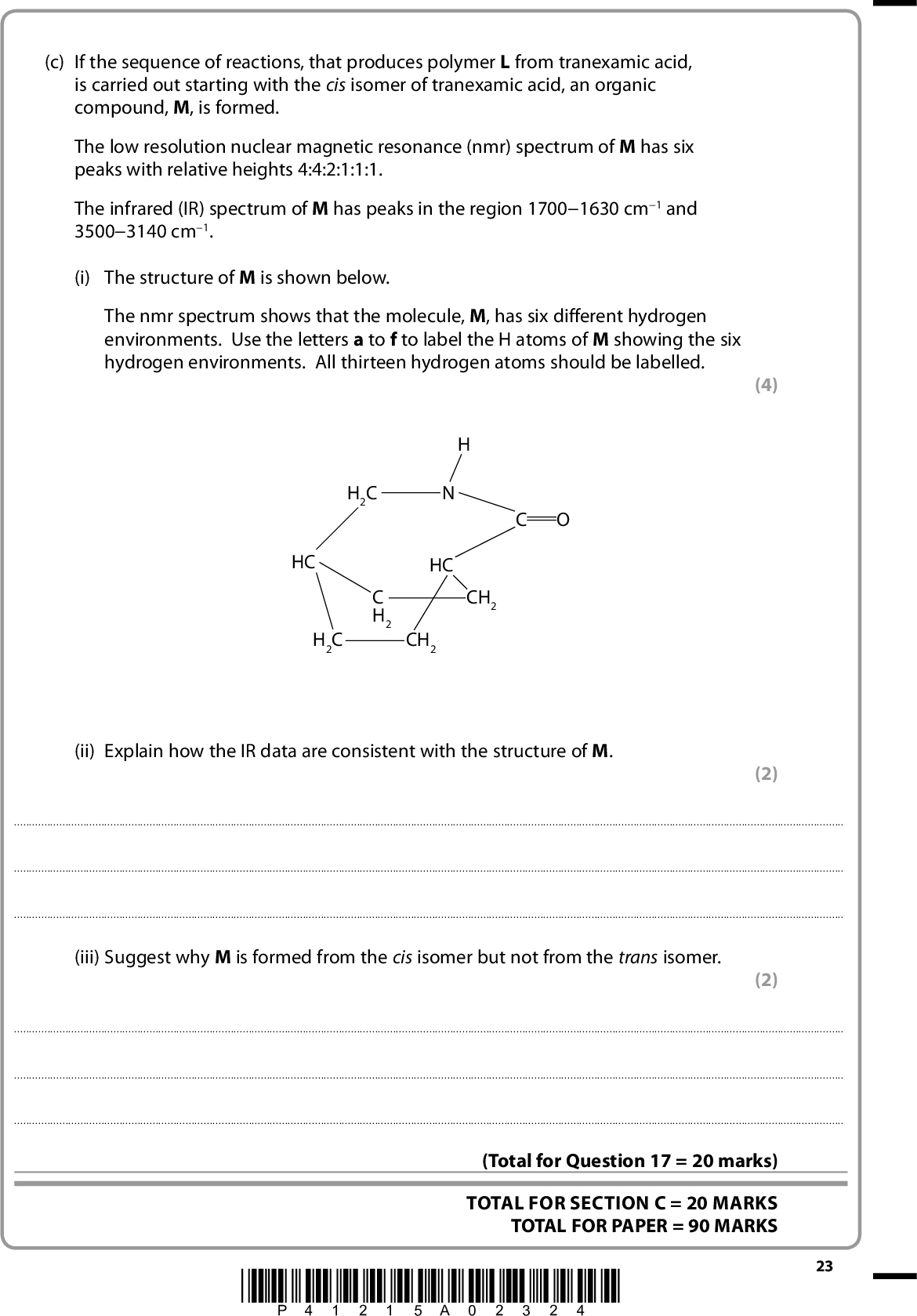 (c) If the sequence of reactions, that produces polymer L from tranexamic acid, is carried out starting with the cis isomer of tranexamic acid, an organic compound, M, is formed. The low resolution nuclear magnetic resonance (nmr) spectrum of M has six peaks with relative heights 4:4:2:1:1:1. The infrared (IR) spectrum of M has peaks in the region 17001630 cm1 and 35003140 cm1. (i) The structure of M is shown below. The nmr spectrum shows that the molecule, M, has six different hydrogen environments. Use the letters a to f to label the H atoms of M showing the six hydrogen environments. All thirteen hydrogen atoms should be labelled. H2C HC C H2 H2C HC CH2 CH2 (ii) Explain how the IR data are consistent with the structure of M. (4) (2)(iii) Suggest why M is formed from the cis isomer but not from the trans isomer. (2)(Total for Question 17 = 20 marks) TOTAL FOR SECTION C = 20 MARKS TOTAL FOR PAPER = 90 MARKS *P41215A02324* 23<br />