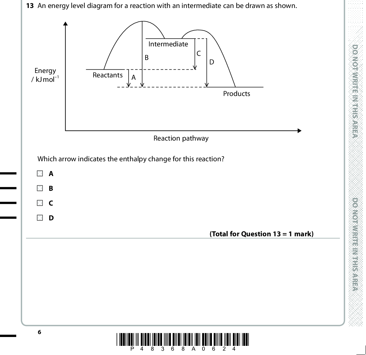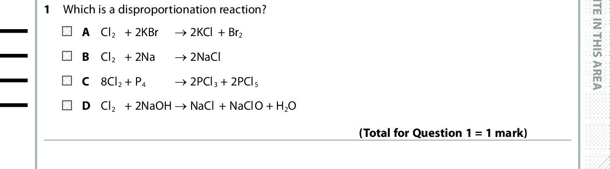SECTION A Answer ALL the questions in this section. You should aim to spend no more than 20 minutes on this section. For each question, select one answer from A to D and put a cross in the box If you change your mind, put a line through the box . . and then mark your new answer with a cross 1 Which is a disproportionation reaction? A Cl2 + 2KBr (cid:111) 2KCl + Br2 B Cl2 + 2Na (cid:111) 2NaCl C 8Cl2 + P4 (cid:111) 2PCl3 + 2PCl5 D Cl2 + 2NaOH (cid:111) NaCl + NaClO + H2O D O N O T W R I T E I N T H I S A R E A (Total for Question 1 = 1 mark) In which of the following would you expect the paired species to have different bond angles? A H2O B NH4 + C BF3 D BeCl2NH2 CH4 NH3 CO2 (Total for Question 2 = 1 mark) 3 Global warming is an environmental concern and results from greenhouse gases trapping radiation from the Earth. Identify the type of radiation involved and its effect on greenhouse gases. Type of radiation Effect Infrared Infrared Ultraviolet Ultraviolet Bond breaking Bond vibration Bond breaking Bond vibration (Total for Question 3 = 1 mark) *P48368A0224* D O N O T W R I T E I N T H I S A R E A D O N O T W R I T E I N T H I S A R E A<br />
