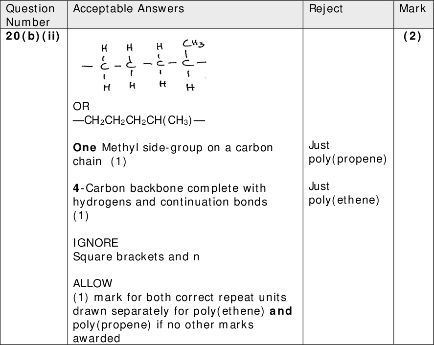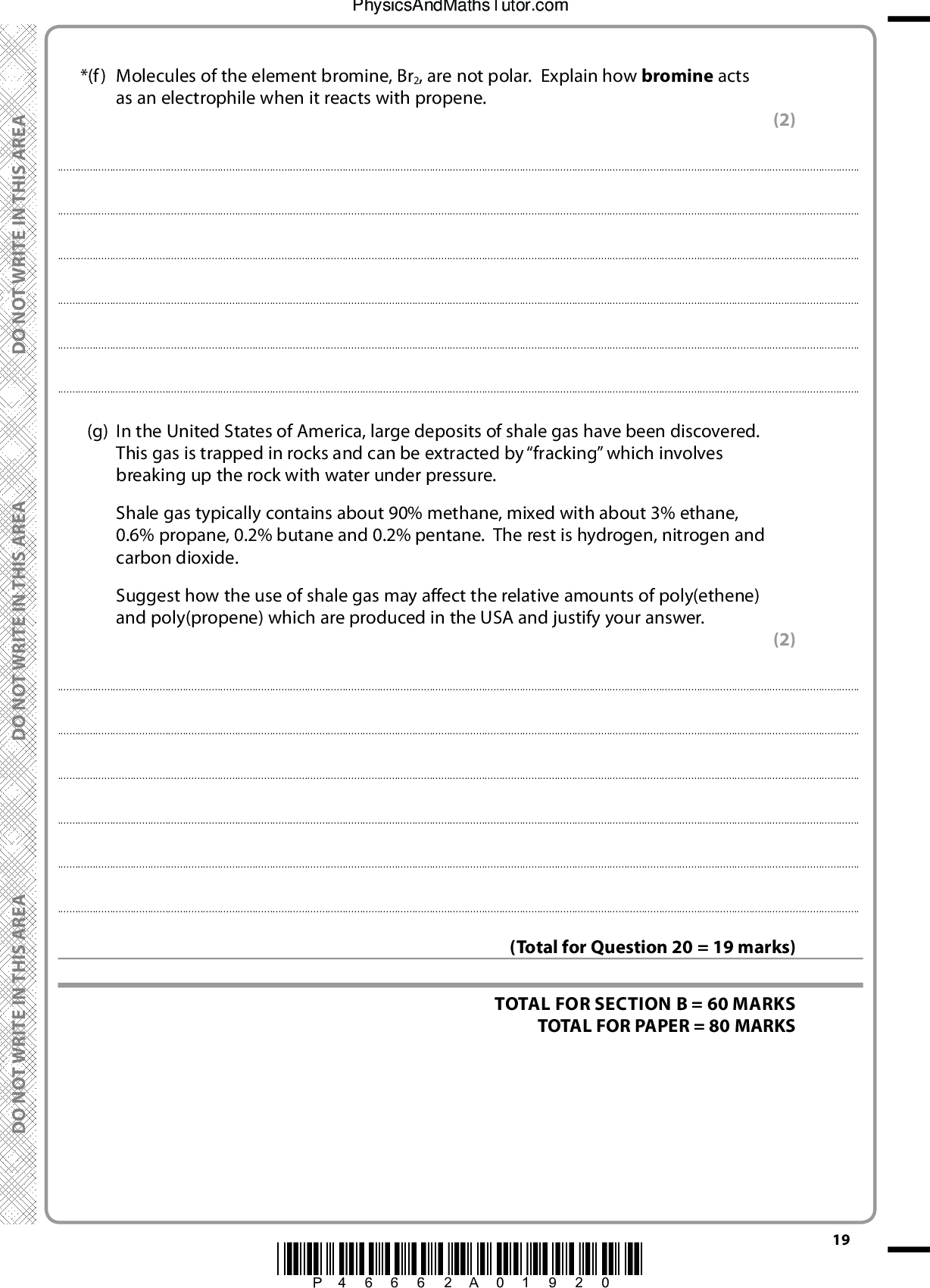 *(f) Molecules of the element bromine, Br2, are not polar. Explain how bromine acts as an electrophile when it reacts with propene. (2)(g) In the United States of America, large deposits of shale gas have been discovered. This gas is trapped in rocks and can be extracted by fracking which involves breaking up the rock with water under pressure. Shale gas typically contains about 90% methane, mixed with about 3% ethane, 0.6% propane, 0.2% butane and 0.2% pentane. The rest is hydrogen, nitrogen and carbon dioxide. Suggest how the use of shale gas may affect the relative amounts of poly(ethene) and poly(propene) which are produced in the USA and justify your answer. (2)(Total for Question 20 = 19 marks) TOTAL FOR SECTION B = 60 MARKS TOTAL FOR PAPER = 80 MARKS A E R A S I H T N I E T I R W T O N O D A E R A S I H T N I E T I R W T O N O D A E R A S I H T N I E T I R W T O N O D *P46662A01920* 19<br />