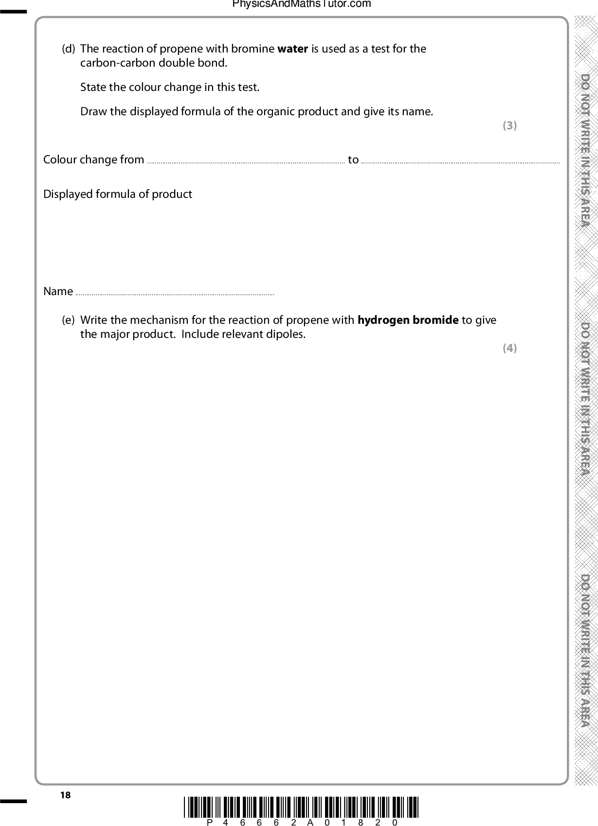 (d) The reaction of propene with bromine water is used as a test for the carbon-carbon double bond. State the colour change in this test. Draw the displayed formula of the organic product and give its name. (3) Colour change fromtoDisplayed formula of product Name(e) Write the mechanism for the reaction of propene with hydrogen bromide to give the major product. Include relevant dipoles. (4) 18 *P46662A01820* D O N O T W R I T E I N T H I S A R E A D O N O T W R I T E I N T H I S A R E A D O N O T W R I T E I N T H I S A R E A<br />