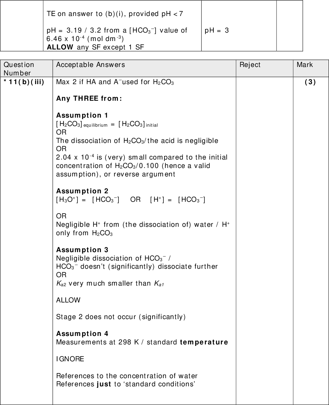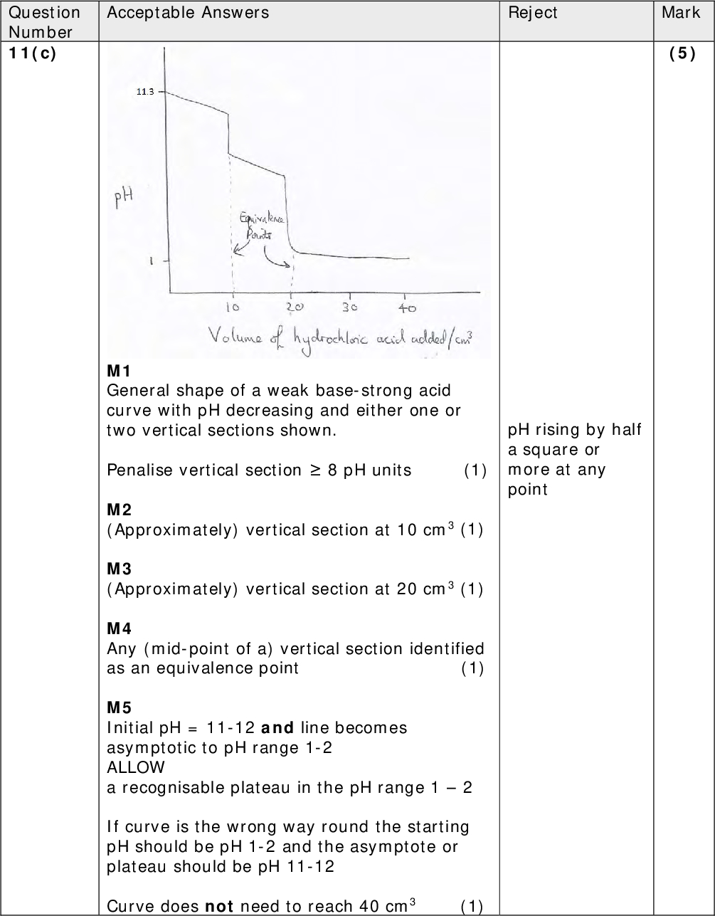 *(iii) State the three assumptions you have made in your calculations in (b)(i) and (b)(ii). (3)(c) Carbonic acid forms two types of salt: carbonates and hydrogencarbonates. A solution of sodium carbonate is titrated with hydrochloric acid. On the grid below, sketch the likely shape of the titration curve during this reaction given that: two moles of H+ ions per mole of carbonate for complete reactioncarbonates require10 cm 3 of sodium carbonate with a concentration of 0.100 mol dm3 is used40 cm 3 of hydrochloric acid with a concentration of 0.100 mol dm3 is addedpK the sodium carbonate solution has a pH of 11.3 a1 = 6.4 and pKa2 = 10.3 Clearly label any equivalence points in the sketch. (5) 14 pH 0 10 Volume of hydrochloric acid added /cm3 20 30 40 A E R A S I H T N I E T I R W T O N O D A E R A S I H T N I E T I R W T O N O D A E R A S I H T N I E T I R W T O N O D *P46664A01528* 15 Turn over (Total for Question 11 = 13 marks)<br />