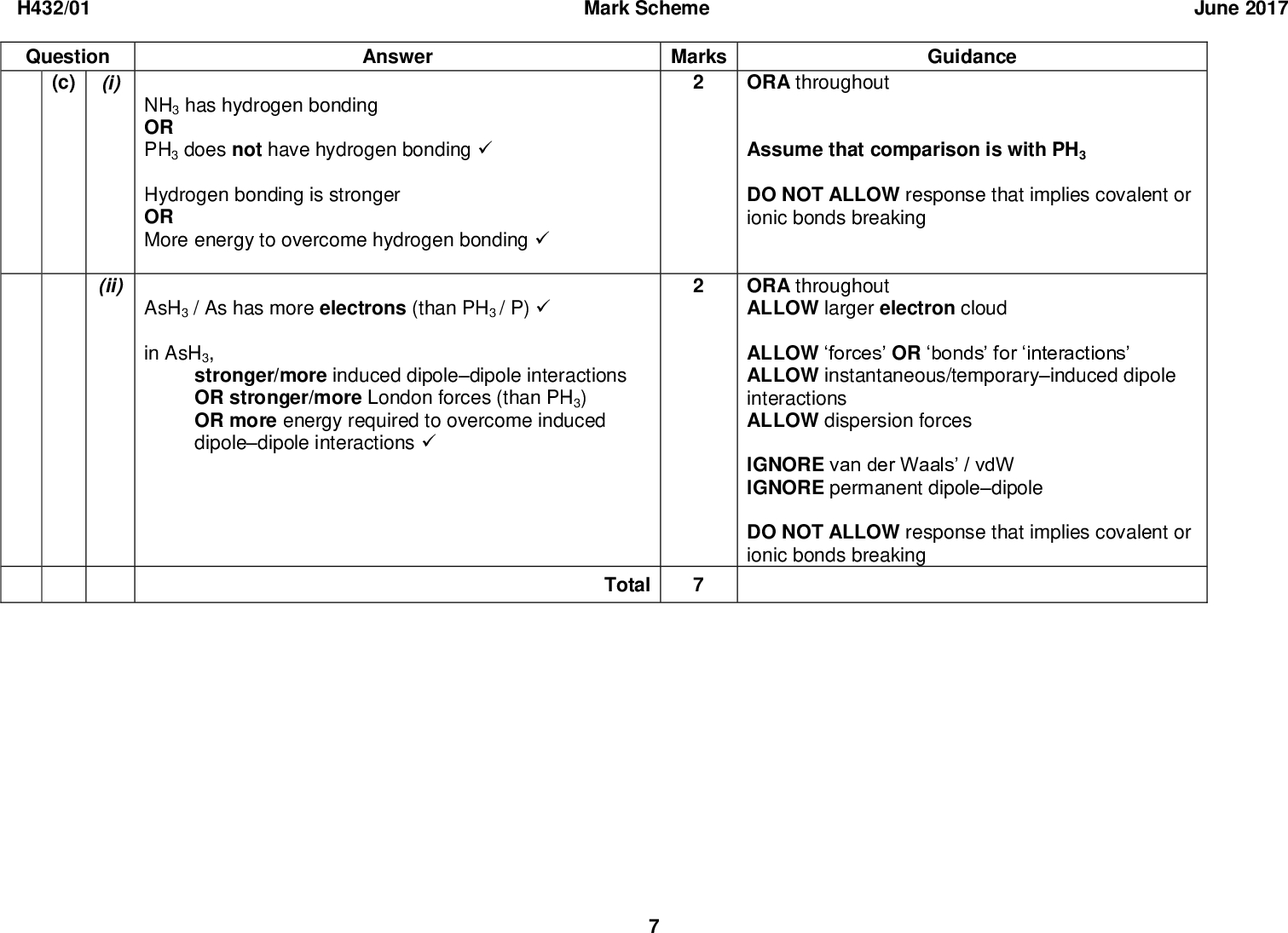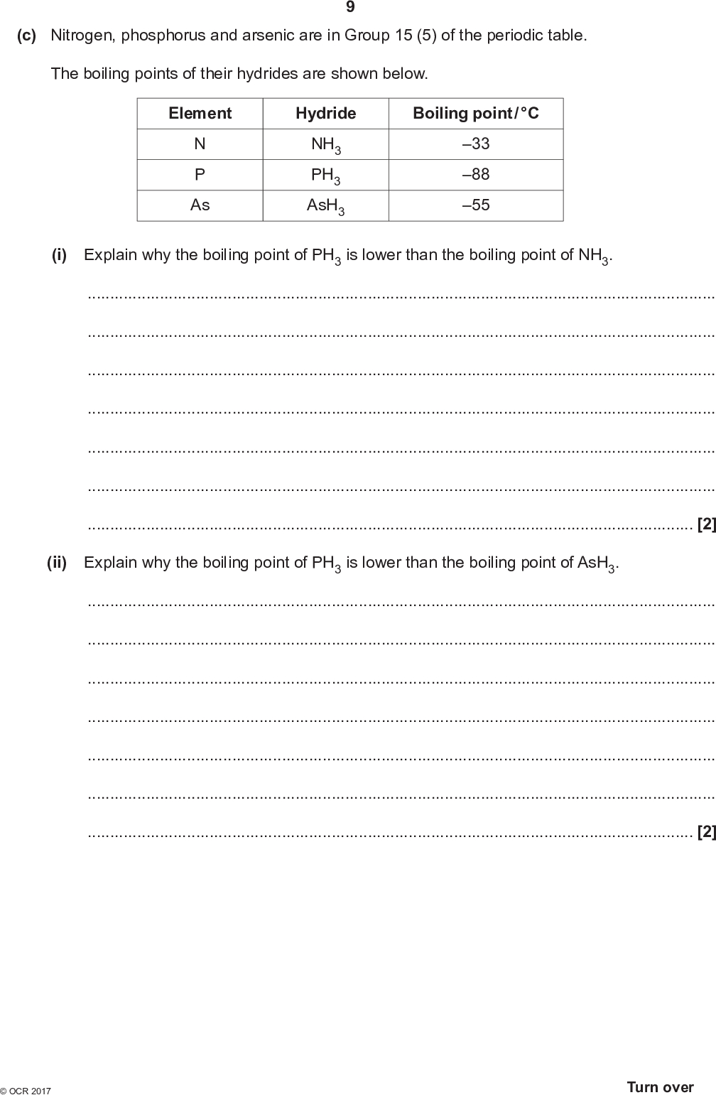 (c) Nitrogen, phosphorus and arsenic are in Group 15 (5) of the periodic table. The boiling points of their hydrides are shown below. Element Hydride Boiling point / C N P As NH3 PH3 AsH3 33 88 55 (i) Explain why the boiling point of PH3 is lower than the boiling point of NH3.[2] (ii) Explain why the boiling point of PH3 is lower than the boiling point of AsH3.[2]<br />