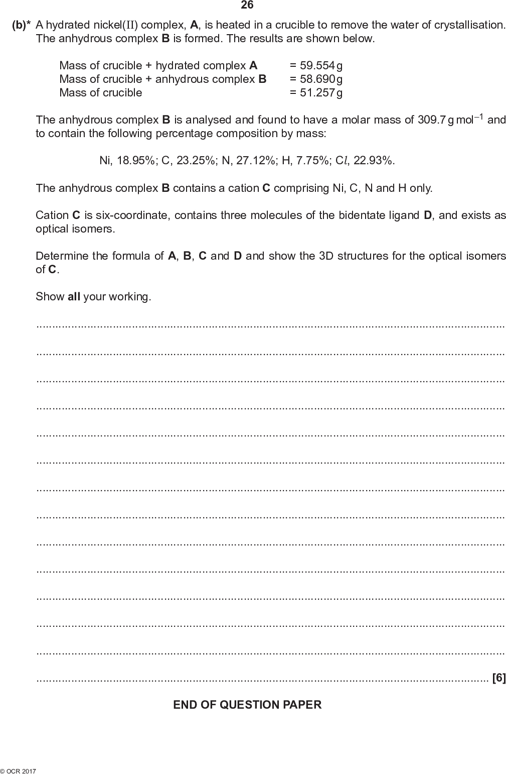 (b)* A hydrated nickel(II) complex, A, is heated in a crucible to remove the water of crystallisation. The anhydrous complex B is formed. The results are shown below. 26 Mass of crucible + hydrated complex A Mass of crucible + anhydrous complex B Mass of crucible = 59.554 g = 58.690 g = 51.257 g The anhydrous complex B is analysed and found to have a molar mass of 309.7 g mol1 and to contain the following percentage composition by mass: Ni, 18.95%; C, 23.25%; N, 27.12%; H, 7.75%; Cl, 22.93%. The anhydrous complex B contains a cation C comprising Ni, C, N and H only. Cation C is six-coordinate, contains three molecules of the bidentate ligand D, and exists as optical isomers. Determine the formula of A, B, C and D and show the 3D structures for the optical isomers of C. Show all your working.[6] END OF QUESTION PAPER<br />